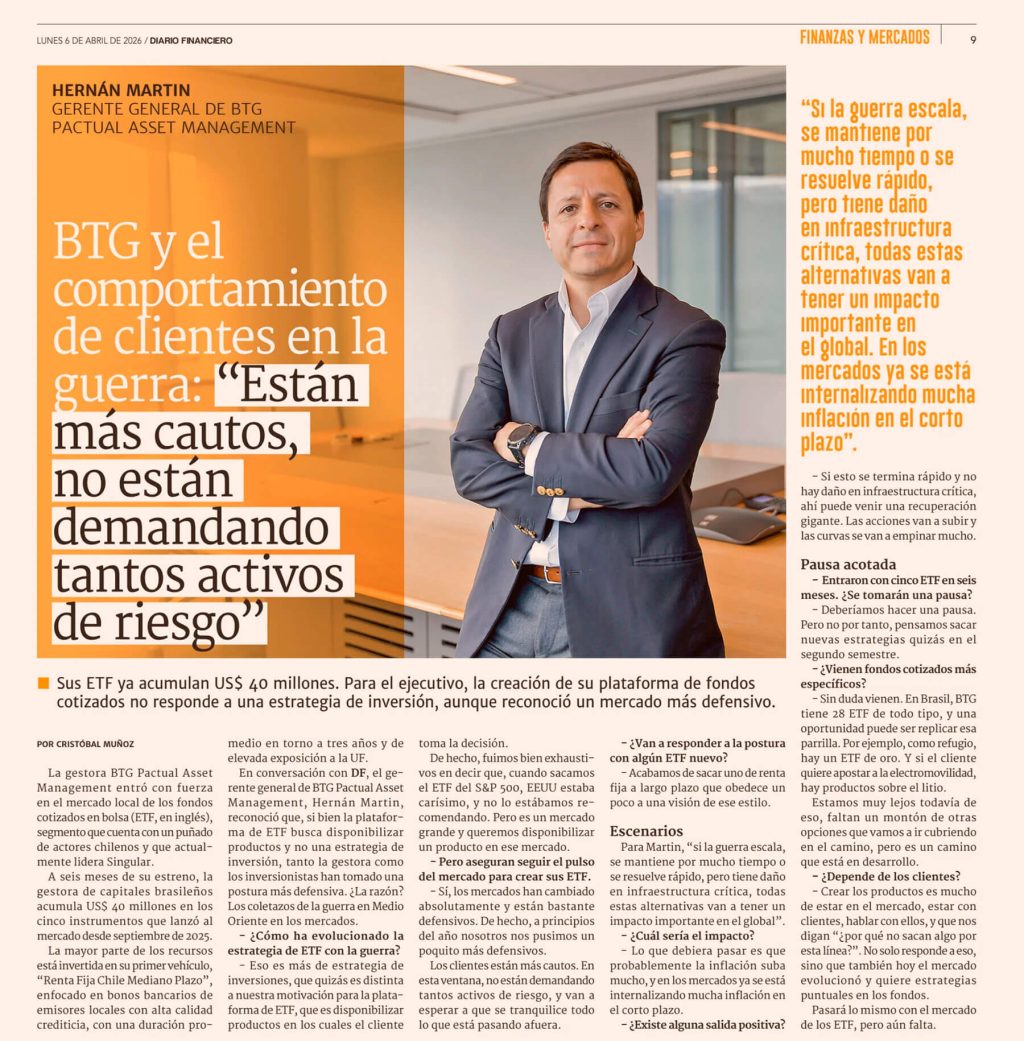 En conversación con DF, el gerente general de BTG Pactual Asset Management, Hernán Martin, reconoció que, si bien la plataforma de ETF busca disponibilizar productos y no una estrategia de inversión, tanto la gestora como los inversionistas han tomado una postura más defensiva. ¿ La razón? Los coletazos de la guerra en Medio Oriente en los mercados.