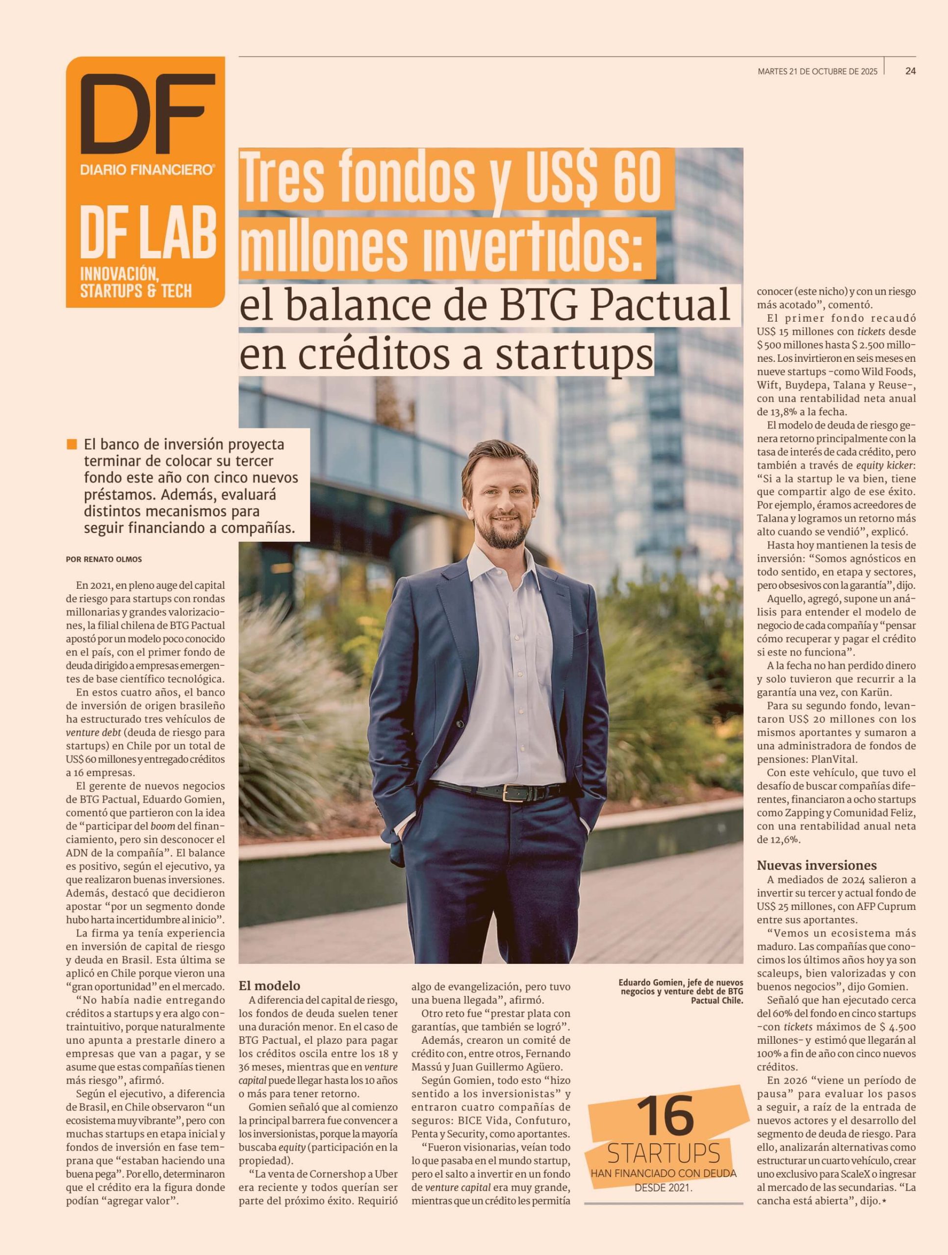 El gerente de nuevos negocios de BTG Pactual, Eduardo Gomien, comentó que partieron con la idea de ‘participar del boom del financiamiento, pero sin desconocer el ADN de la compañía’. El balance es positivo, según el ejecutivo, ya que realizaron buenas inversiones. Además, destacó que decidieron apostar ‘por un segmento donde hubo harta incertidumbre al inicio’.