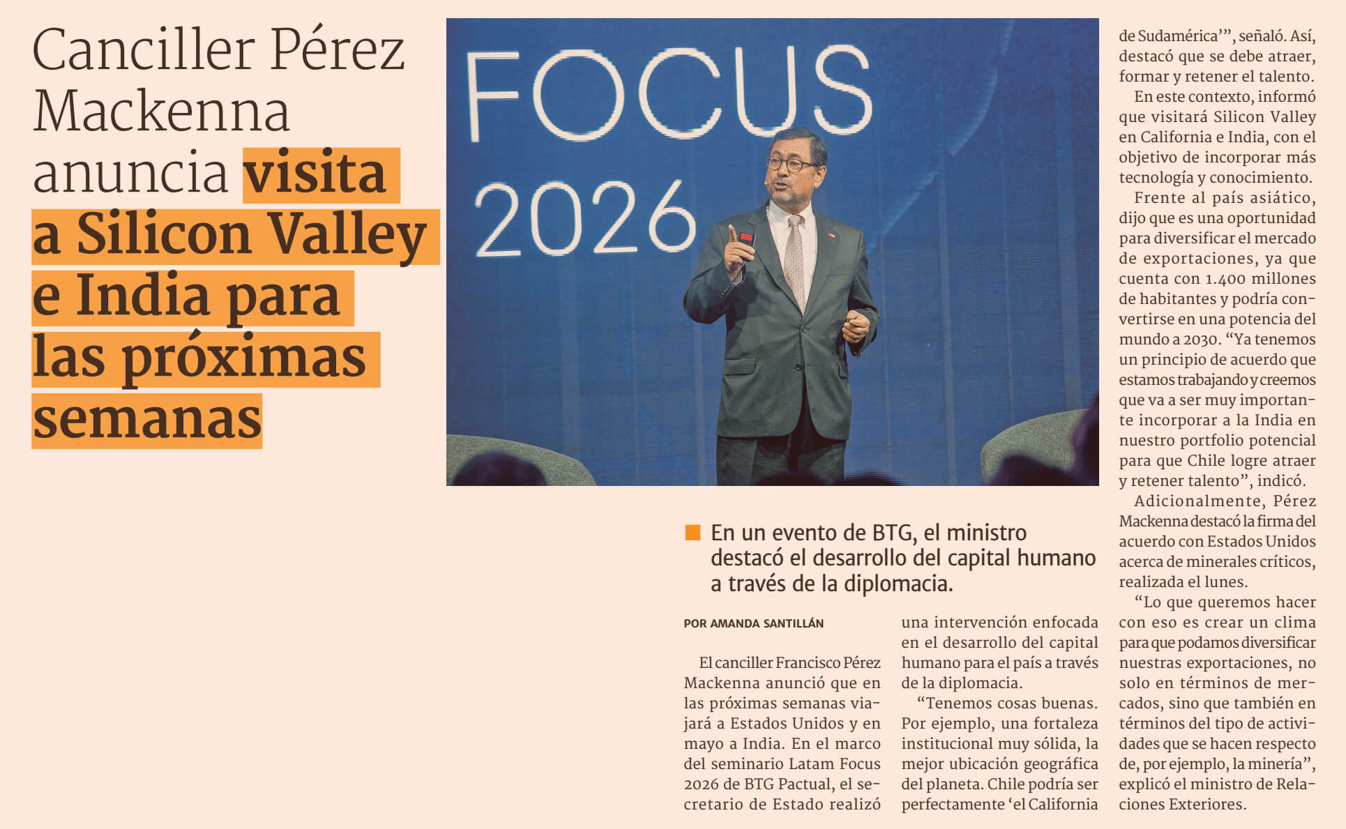 El canciller Francisco Pérez Mackenna anunció que en las próximas semanas viajará a Estados Unidos y en mayo a India. En el marco del seminario Latam Focus 2026 de BTG Pactual, el secretario de Estado realizó una intervención enfocada en el desarrollo del capital humano para el país a través de la diplomacia.
