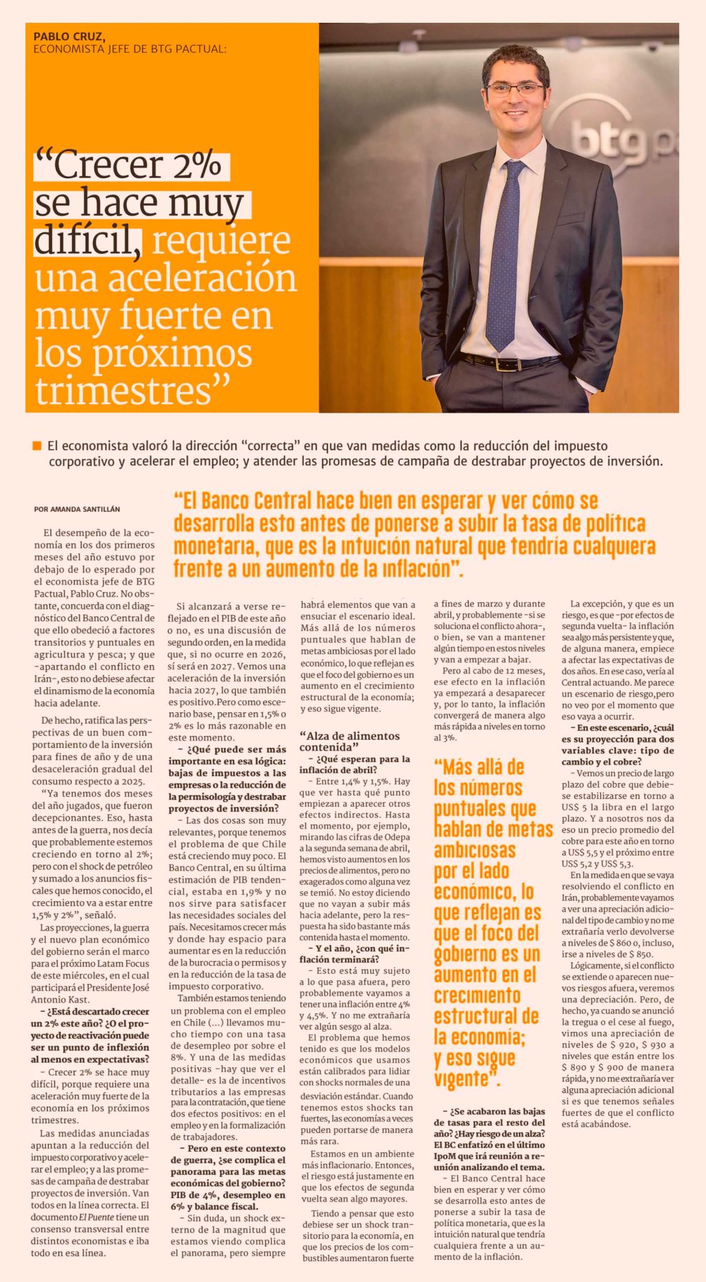El desempeño de la economía en los dos primeros meses del año estuvo por debajo de lo esperado por el economista jefe de BTG Pactual, Pablo Cruz. No obstante, concuerda con el diagnóstico del Banco Central de que ello obedeció a factores transitorios y puntuales en agricultura y pesca; y que -apartando el conflicto en Irán-, esto no debiese afectar el dinamismo de la economía hacia adelante.