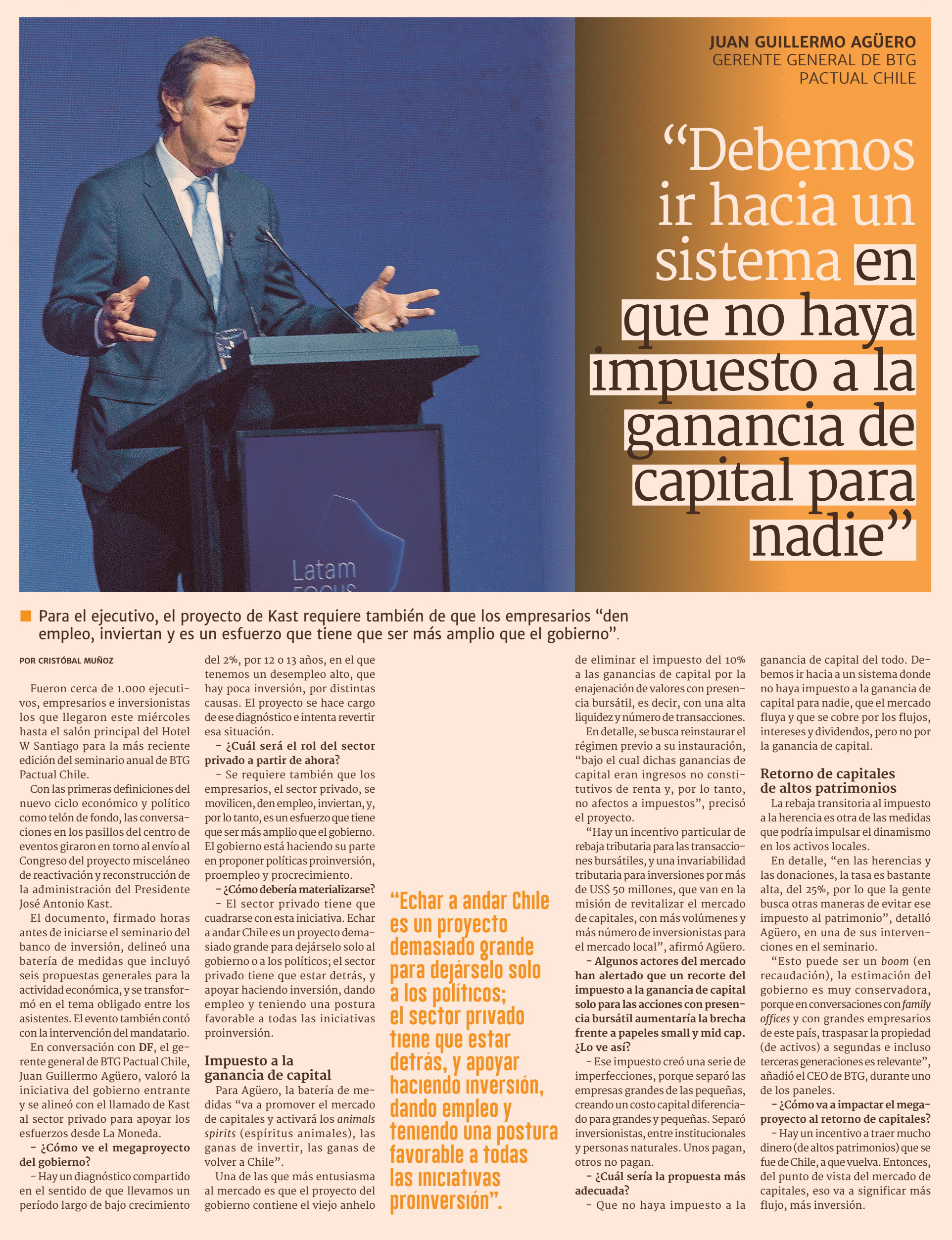 En conversación con DF, el gerente general de BTG Pactual Chile, Juan Guillermo Agüero, valoró la iniciativa del gobierno entrante y se alineó con el llamado de Kast al sector privado para apoyar los esfuerzos desde La Moneda.