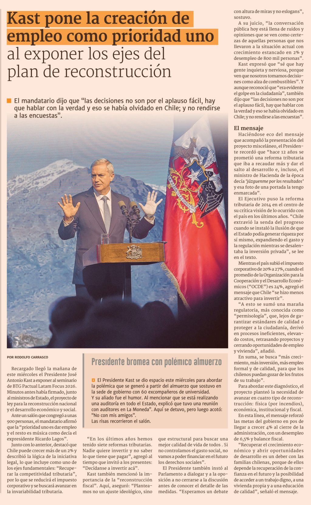 Recargado llegó la mañana de este miércoles el Presidente José Antonio Kast a exponer al seminario de BTG Pactual Latam Focus 2026. Minutos antes había firmado, junto al ministros de Estado, el proyecto de ley para la reconstrucción nacional y el desarrollo económico y social.