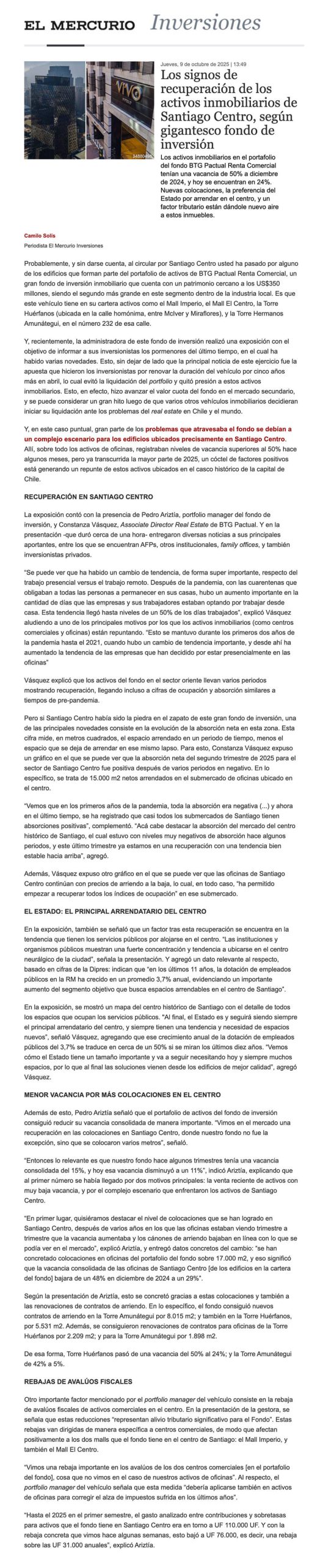 Y, en este caso puntual, gran parte de los problemas que atravesaba el fondo se debían a un complejo escenario para los edificios ubicados precisamente en Santiago Centro. Allí, sobre todo los activos de oficinas, registraban niveles de vacancia superiores al 50% hace algunos meses, pero ya transcurrida la mayor parte de 2025, un cóctel de factores positivos está generando un repunte de estos activos ubicados en el casco histórico de la capital de Chile.