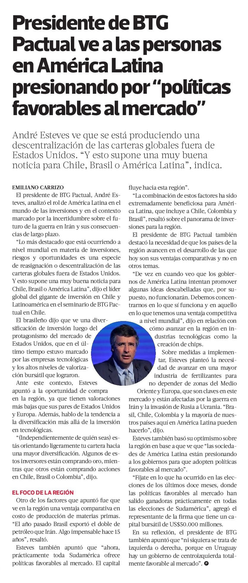 ‘Lo más destacado que está ocurriendo a nivel mundial en materia de inversiones, riesgos y oportunidades es una especie de reasignación o descentralización de las carteras globales fuera de Estados Unidos. Y esto supone una muy buena noticia para Chile, Brasil o América Latina’, dijo el líder global del gigante de inversión en Chile y Latinoamérica en el seminario de BTG Pactual en Chile.