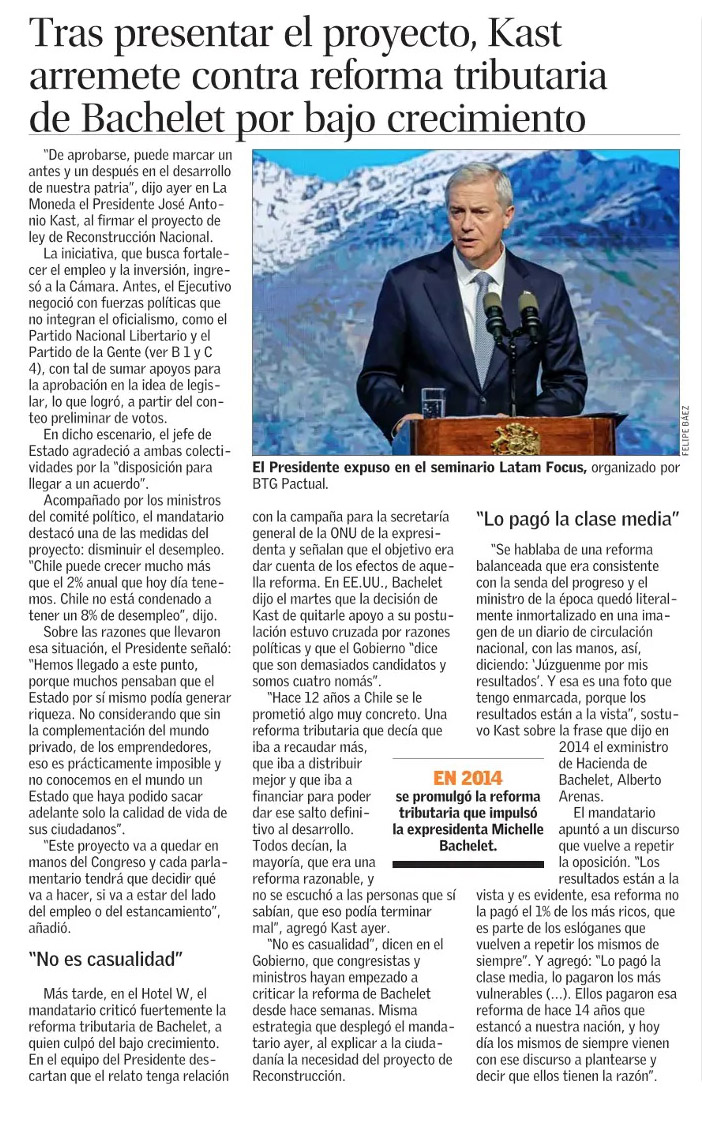 Más tarde, en el Hotel W, el mandatario criticó fuertemente la reforma tributaria de Bachelet, a quien culpó del bajo crecimiento. En el equipo del Presidente descartan que el relato tenga relación con la campaña para la secretaría general de la ONU de la expresidenta y señalan que el objetivo era dar cuenta de los efectos de aquella reforma. En EE.UU., Bachelet dijo el martes que la decisión de Kast de quitarle apoyo a su postulación estuvo cruzada por razones políticas y que el Gobierno ‘dice que son demasiados candidatos y somos cuatro nomás’.