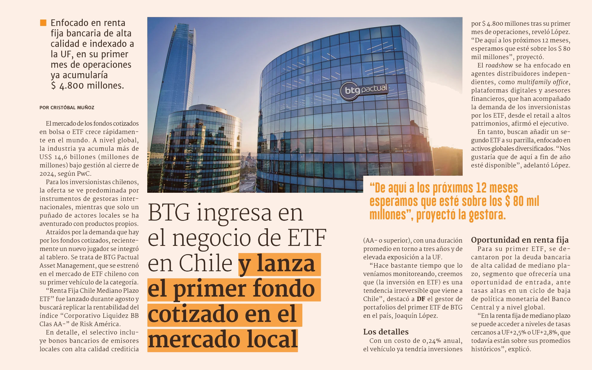 Con un costo de 0,24% anual, el vehículo ya tendría inversiones por $4.800 millones tras su primer mes de operaciones, reveló López. «De aquí a los próximos 12 meses, esperamos que esté sobre los 80 mil millones», proyectó.