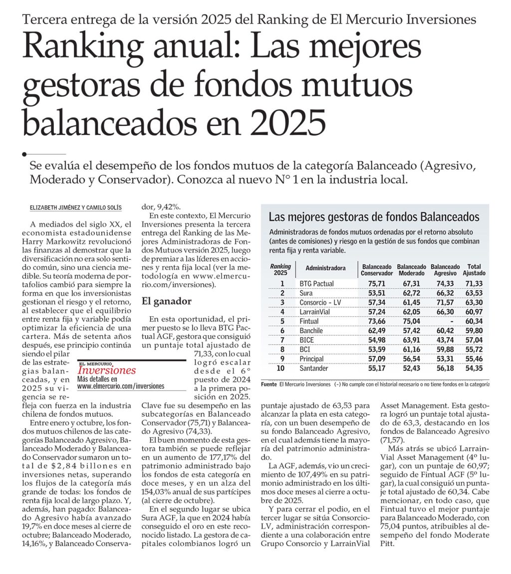 En este contexto, El Mercurio Inversiones presenta la tercera entrega del Ranking de las Mejores Administradoras de Fondos Mutuos versión 2025, luego de premiar a las líderes en acciones y renta fija local (ver la metodología en www.elmercurio.com/inversiones). El ganador En esta oportunidad, el primer puesto se lo lleva BTG Pactual AGF, gestora que consiguió un puntaje total ajustado de 71,33, con lo cual logró escalar desde el 6° puesto en 2024 a la primera posición en 2025. Clave fue su desempeño en las subcategorías en Balanceado Conservador (75,71) y Balanceado Agresivo (74,33).