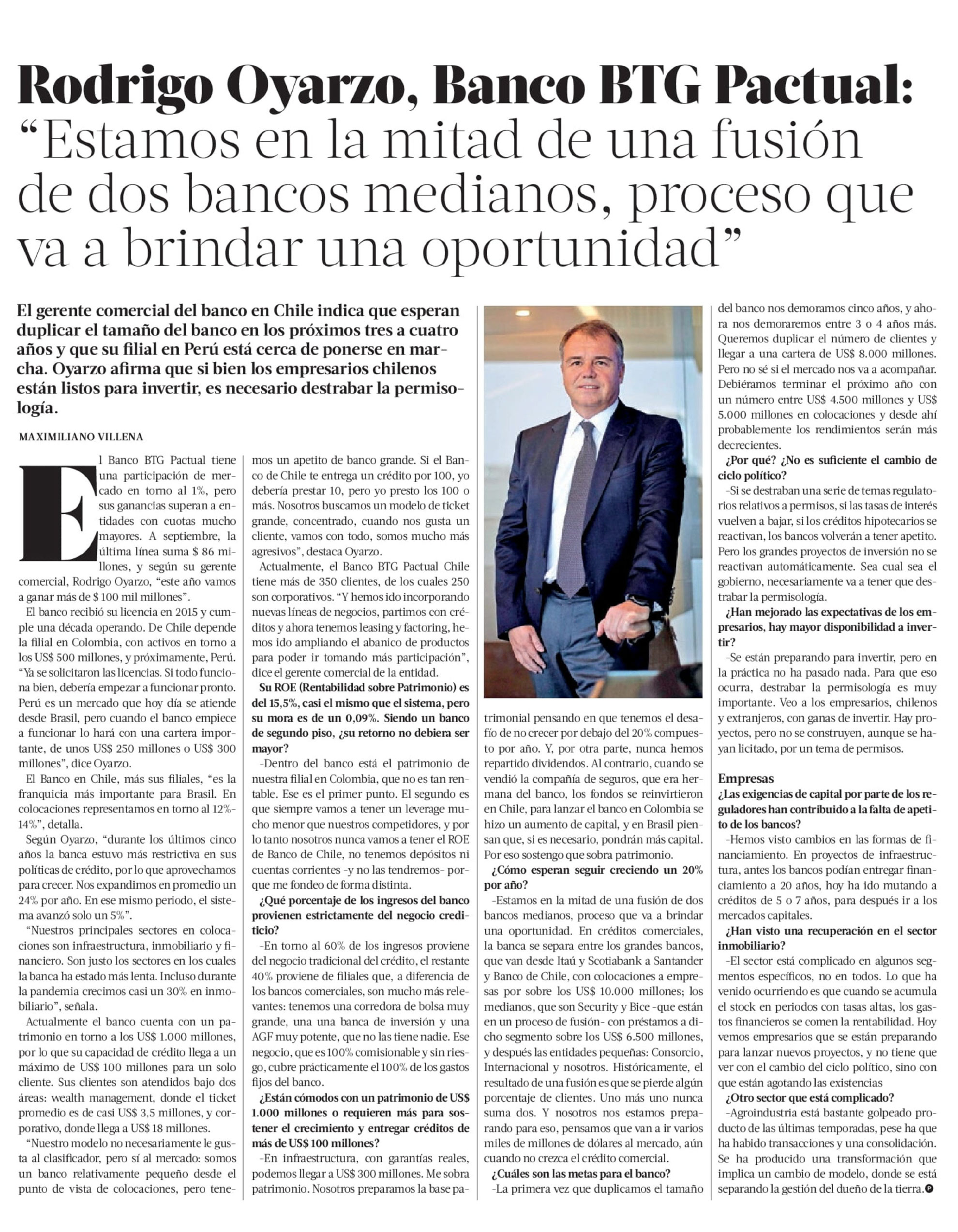 Rodrigo Oyarzo, Banco BTG Pactual: "Estamos en la mitad de una fusión de dos bancos medianos, proceso que va a brindar una oportunidad"