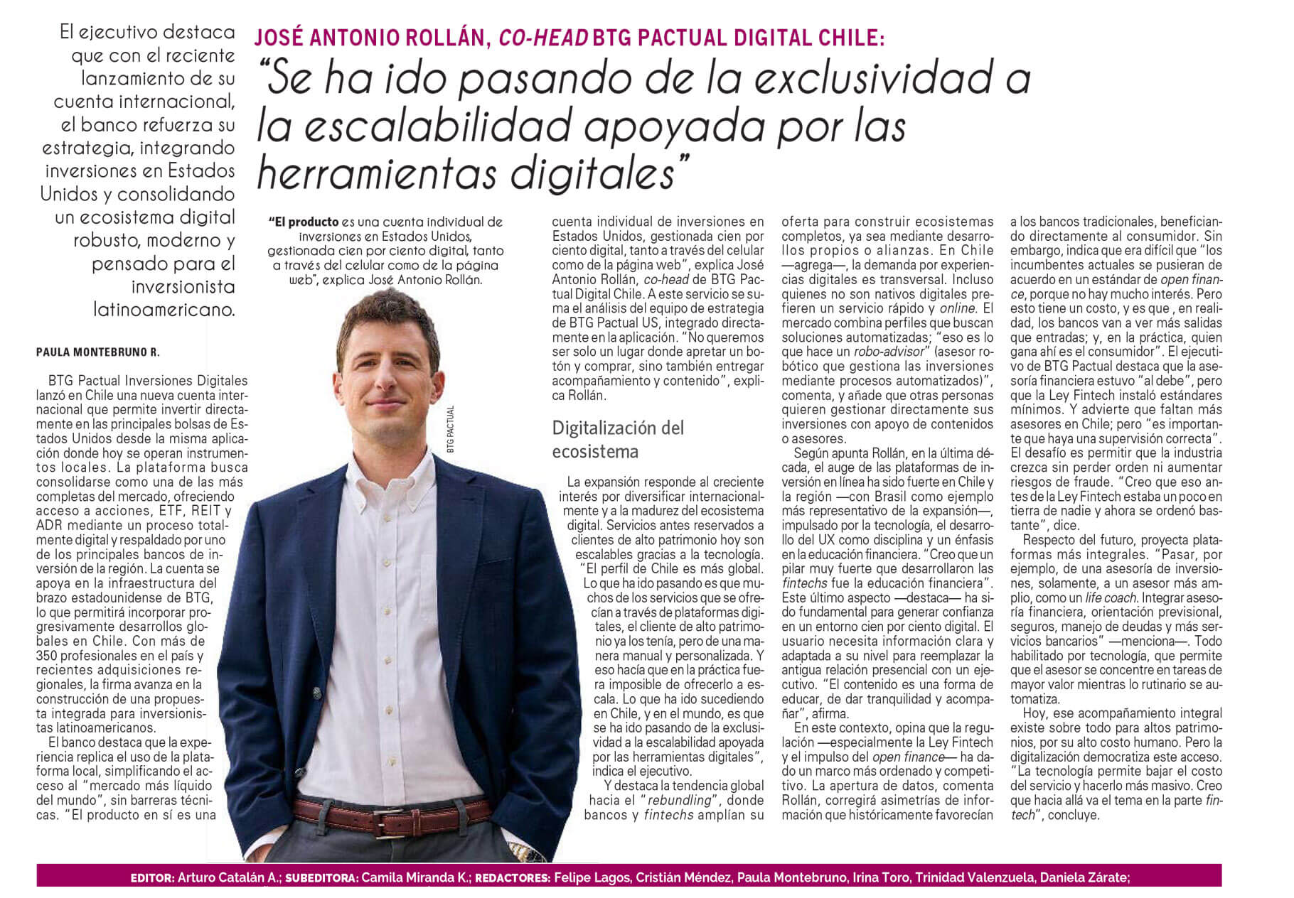 El banco destaca que la experiencia replica el uso de la plataforma local, simplificando el acceso al “mercado más líquido del mundo”, sin barreras técnicas. “El producto en sí es una cuenta individual de inversiones en Estados Unidos, gestionada cien por ciento digital, tanto a través del celular como de la página web”, explica José Antonio Rollán, co-head de BTG Pactual Digital Chile. A este servicio se suma el análisis del equipo de estrategia de BTG Pactual US, integrado directamente en la aplicación. “No queremos ser solo un lugar donde apretar un botón y comprar, sino también entregar acompañamiento y contenido”, explica Rollán.